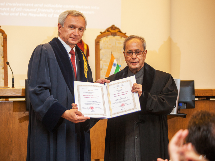 На ўрачыстым сходзе прэзідэнт Індыі быў удастоены звання ганаровага прафесара БДУ. Дыплом Пранабу Мукерджы ўручыў рэктар акадэмік Сяргей Абламейка. Такой узнагародай індыйскі дзяржаўны дзеяч ушанаваны за вялікі асабісты ўнёсак ва ўмацаванне і развіццё ўсебаковых сяброўскіх адносін паміж Індыяй і Беларуссю.