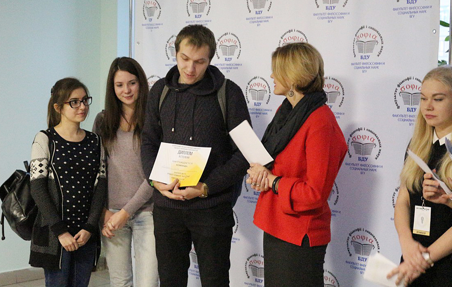 Пікет у фармаце конкурсу “Мазгавы шторм” студэнцкай алімпіяды па псіхалогіі “Псіаламп”. На фота – супрацоўнікі кафедры псіхалогіі, Сакаловіч Кацярына Аркадзьеўна — суддзя “форуму”, вядучы пікету — Хонскі Сяргей Ігаравіч, суддзя “форуму” — Давыдовіч Ганна Аляксандраўна і адзін з арганізатараў квэсту, а таксама суддзя “форуму” — Фафанава Галіна Аляксандраўна