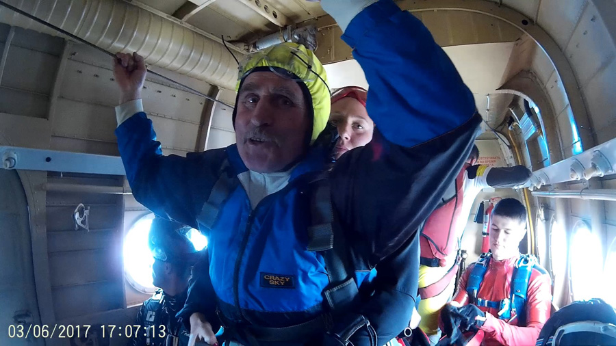 — У 1969 годзе адбыўся мой першы скачок. У аэраклубе мяне навучылі правільна ўкладваць парашут і за што тузаць, калі ты ўжо скокнуў, хоць ён павінен адкрывацца і так, але тым не менш пры форс-мажоры ты павінен гэта зрабіць сам. Усім было боязна выскокваць з самалёта ў бездань, калі пад табой 800–900 метраў. Дзверы адчыняюцца, ты глядзіш уніз, і, вядома, ёсць пачуццё страху, якое ты пераступаеш, і з крыкам «ура!» робіш крок – і паляцеў. Тры першыя мае скачкі былі ў аэраклубе, астатнія – армія, служба, ваенныя зборы. Доўгі час меў шкодную звычку курыць, але ў 50 гадоў кінуў: у дзень чарговага скачка з парашутам вырашыў, што хопіць. Крайні, 49-ы, скачок я здзейсніў 5 гадоў таму ў аэраклубе Баравая, калі мне споўнілася 60 гадоў. Там мяне добра ведаюць (смяецца).