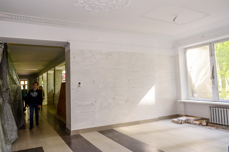 Цяпер бягучы рамонт праводзіцца ў холе галоўнага корпуса. Каб не перашкаджаць навучальнаму працэсу, было вырашана ажыццяўляць будаўнічыя працы па захватках, падзяліўшы хол на часткі. Як пераконвае прарэктар, усё застанецца на сваіх месцах – гардэроб, буфет, вахта. Неўзабаве мы ўсе зможам ацаніць абноўленыя сцены (тынкоўка пад мармур), падлогу з керамаграніту і столь з абноўленай ляпнінай.